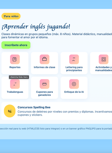 Ubetcha es una academia de inglés moderna y dinámica que ofrece programas de enseñanza para todos los niveles: desde niños hasta profesionales en entornos corporativos.